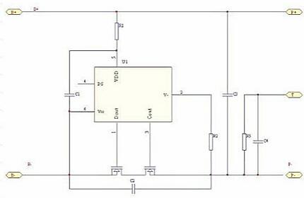 保護(hù)板有兩個(gè)核心部件:一塊保護(hù)IC,它是由精確的比較器來(lái)獲得可靠的保護(hù)參數(shù);另外是MOSFET串在主充放電回路中擔(dān)當(dāng)高速開(kāi)關(guān),執(zhí)行保護(hù)動(dòng)作。電路原理圖如下: