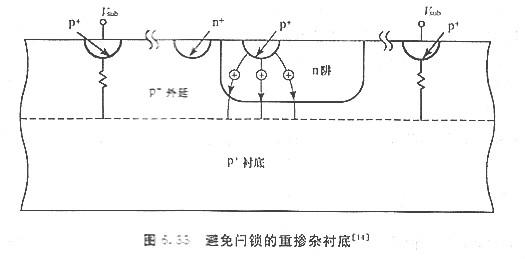 為避免發(fā)生閂鎖效應(yīng),必須減少寄生雙極型晶體管的電流增益,一種方法是使用金摻雜或中子輻射,以降低少數(shù)載流子的壽命,但此方法不易控制且也會(huì)導(dǎo)致漏電流的增加.深阱結(jié)構(gòu)或高能量注入以形成倒退阱( retrograde well),可以提升基極雜質(zhì)濃度,因而降低縱向雙極型晶體管的電流增益.在倒退阱結(jié)構(gòu)中,阱摻雜濃度的峰值位于遠(yuǎn)離表面的襯底中.另一種減少閂鎖效應(yīng)的方法,是將器件制作于高摻雜襯底上的低摻雜外延層中,如圖6. 33所示.高摻雜襯底提供一個(gè)收集電流的高傳導(dǎo)路徑,這些電流隨后會(huì)由表面接點(diǎn)流出.